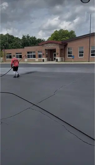 We apply one coat of high-grade polymer modified asphalt emulsion sealer—edges are hand-brushed for precision, and the main area is sprayed or squeegee-applied for even coverage—we add sand additive for better traction if requested