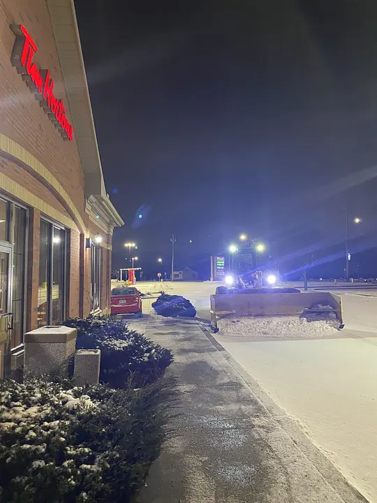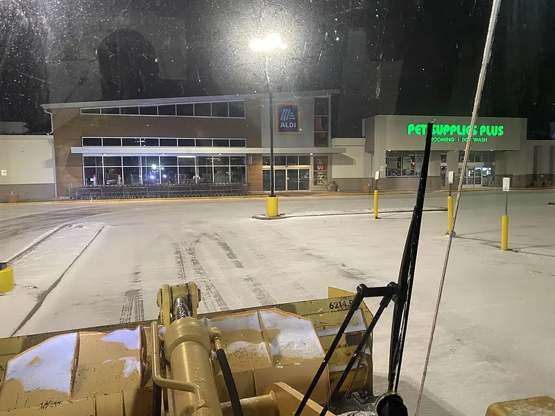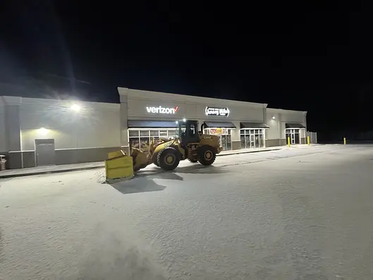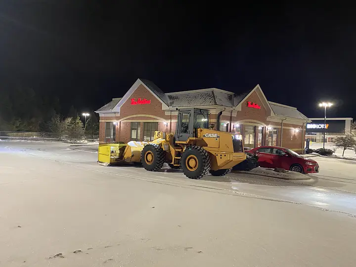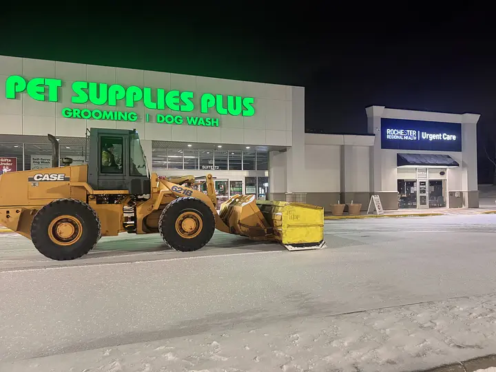 Commercial plows, loaders, and blowers efficiently clear parking lots and drives; sidewalks and entrances are hand-shoveled for precision